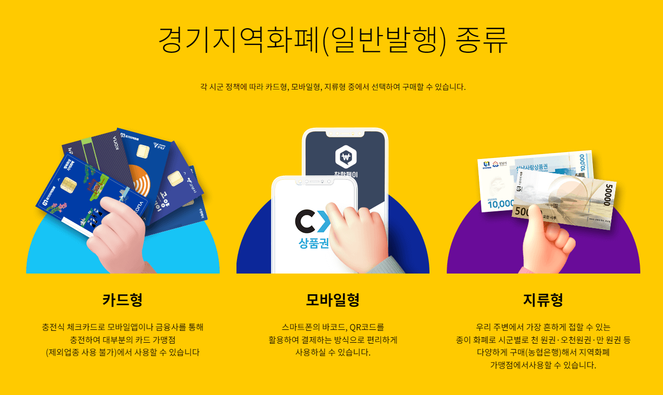 경기지역화폐에는 카드형, 모바일형, 지류형, 이렇게 3가지 중에서 선택하여 구매할 수 있습니다.