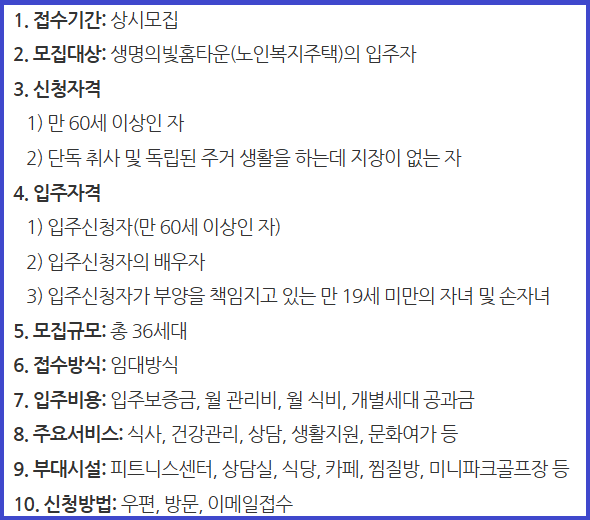 아래는 민간형 노인 복지주택의 공고문입니다. 기관마다 자격조건과 서비스 내용이 다르겠지만 대체로 아래와 같다고 보시면 됩니다.