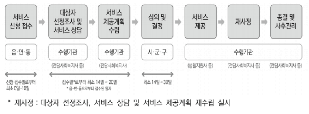 ※ 신청 절차 : 서비스 신청 접수 → 상담 및 필요서류 제출(신분증, 건강보험 자격확인서 등) → 생활 실태 조사 및 서비스 적합 여부 심사 → 서비스 제공계획 수립 → 서비스 제공