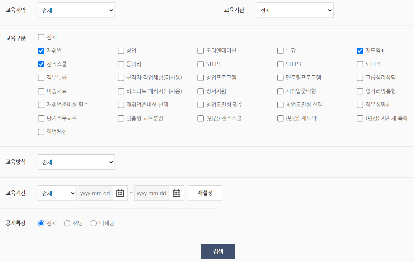전직 재취업 지원 서비스 홈페이지 접속 → 교육 신청 → 교육지역/기관/구분/방식/기간 별 프로그램 선택 → 교육 신청 완료