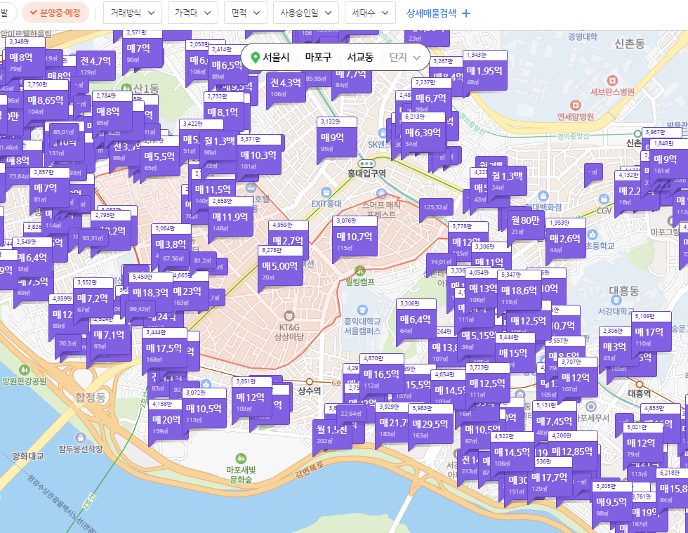 부동산써브도 마찬가지로 아파트, 주택, 원룸, 상가, 빌딩 관련 매물을 보실 수 있고, 자신이 원하는 지역을 선택하신 뒤에 가격이나 면적 등 필터를 걸어서 원하는 물건을 보실 수 있습니다.