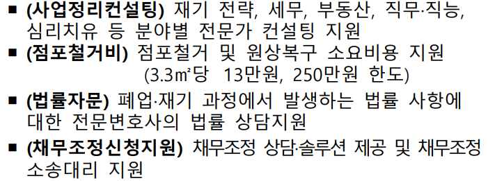 쉽게 말하면 사업 재기 전략, 세무, 부동산, 심리치유 등 분야별 전문가의 컨설팅과 점포 내 시설, 집기를 철거하거나 원상복구 하는데 필요한 비용을 지원하고, 폐업이나 재기하는 과정에서 발생하는 법률 상담과 채무조정 상담 및 솔루션을 지원합니다.