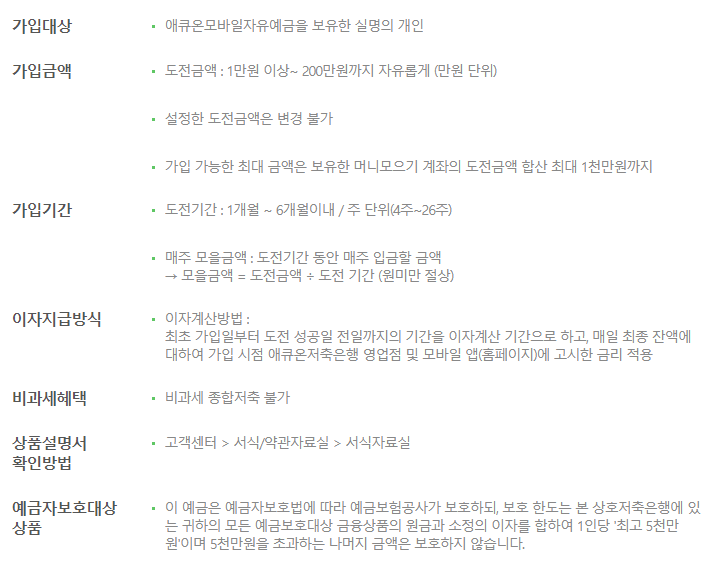 애큐온 저축은행의 머니모으기 통장은 최저 2.0% ~ 최대 5.0%의 금리를 제공합니다. 1만 원 ~ 200만 원까지 도전 금액을 설정하고 도전 기간을 정하여 매주 일정한 금액을 납부하면 됩니다. 사회초년생들이 가입하면 좋아 보이는 상품입니다.
