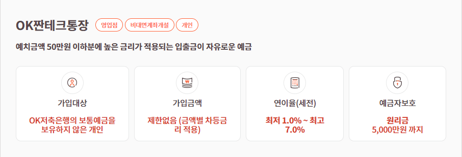 OK짠테크통장은 OK저축은행의 보통예금을 보유하지 않은 개인이 가입대상이며, 가입금액은 제한이 없습니다. 연이율은 최저 1.0% ~ 최고 7.0%이며 5,000만 원까지 예금자보호가 되는 상품입니다. 금리는 50만 원 이하는 7.0%, 1억 원 이하는 연 3.3%, 1억 원 초과는 연 1.0%의 금리를 제공합니다.